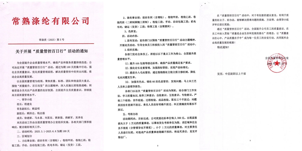 Sejak pelancaran kempen "Kawalan Kualiti Hundred Day" pada 1 Mac, 2025, Changshu Polyester telah berlabuh matlamat pengurusan kualiti yang komprehensif dengan tema "peningkatan kualiti, kempen seratus hari", dan mengetatkan "injap keselamatan" kualiti melalui pelbagai dimensi dan langkah. Data menunjukkan bahawa bilangan aduan dari kedua -dua unit perniagaan semasa acara telah berkurangan berbanding tahun lepas, dan terdapat peningkatan yang signifikan dalam kesedaran kualiti dan pengoptimuman proses.